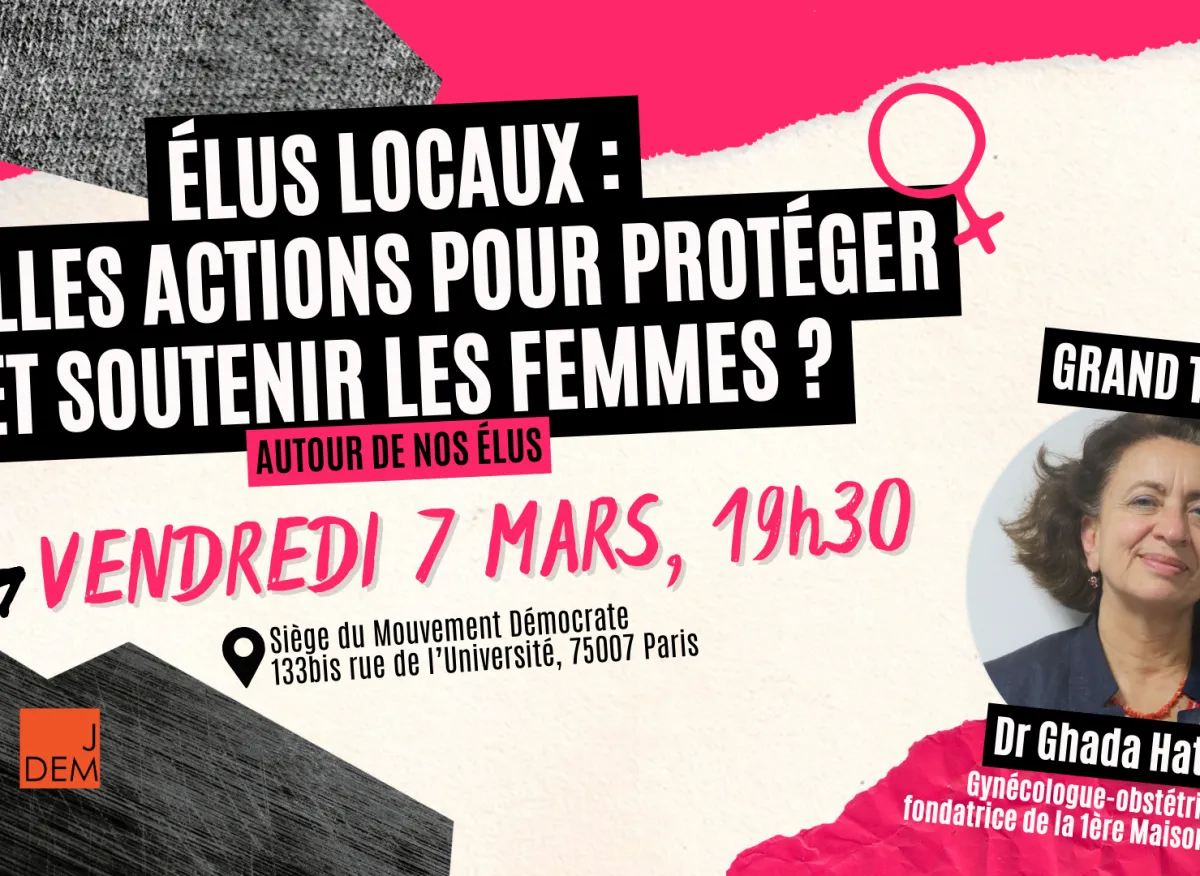 Le 7 mars prochain, à 19h30, à la veille de la Journée internationale des droits des femmes, le Mouvement Démocrate organisera un grand débat intitulé « Élus locaux : quelles actions pour protéger et soutenir les femmes ? ». Cet événement mettra en lumière les initiatives concrètes mises en place dans les territoires pour garantir les droits des femmes.