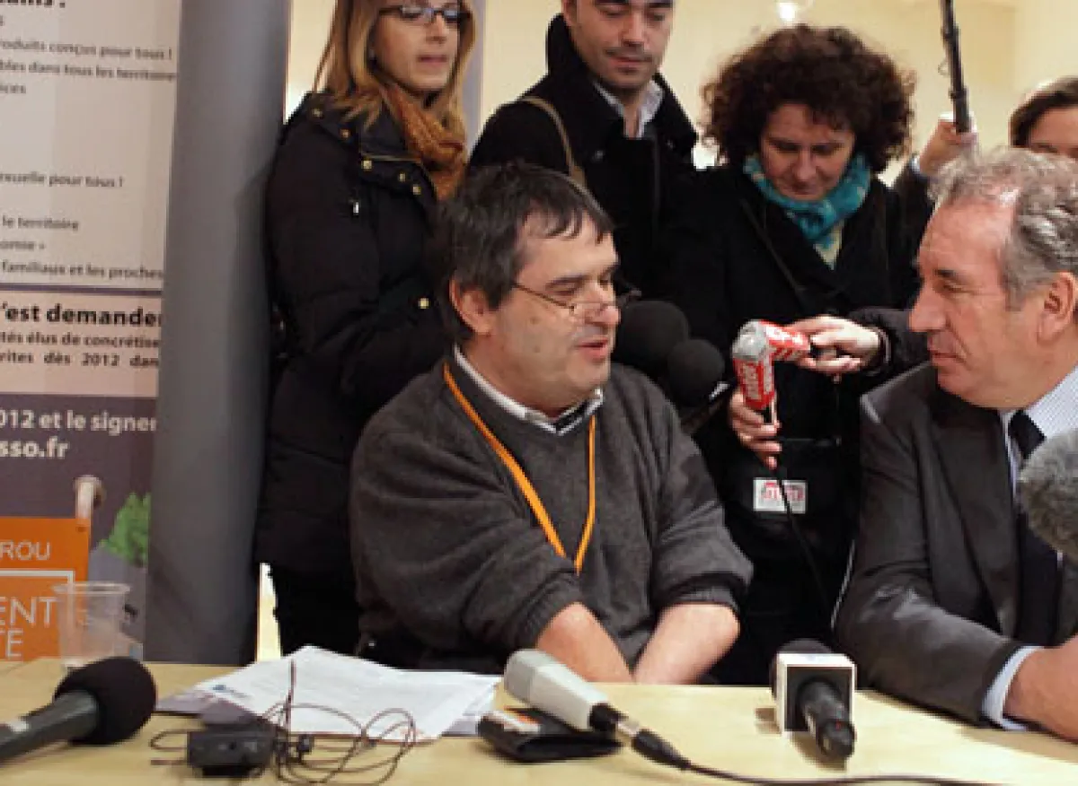 François Bayrou a rencontré Jean-Marie Barbier, président de l'Association des Paralysés de France, qui porte le "Pacte 2012 pour la défense des droits des personnes handicapées", jeudi 26 janvier.